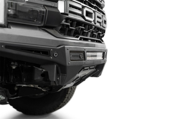 The Rock Fighter Front Bumper features a low-profile fitment, steel construction, and satin black accent panels. Our bumper includes a 3/16-inch aluminum skid plate with integrated air vents on the plate to ensure there's proper airflow to the intercooler. Our design retains the OEM parking sensors and intercooler. Add-on our Adaptive Cruise Control Relocation Bracket to maintain full use of your ACC capabilities. Additionally, the Shutter Motor Relocation Kit is necessary on 2024+ model years to ensure there are no check engine lights when removing lower grille shutters for bumper installation. The integrated light mount gives you the option of attaching a 20-inch dual row radius LED light bar or six cube lights in the center of the bumper. Finished in a two stage hammer black powder coat your front bumper will be protected from scratches. Made in America.