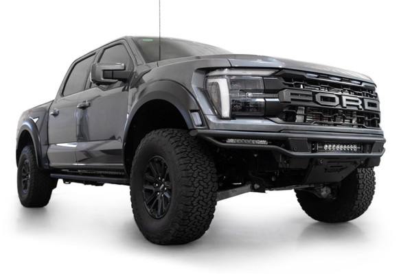 Our Race Series Front Bumper features an aggressive tubular build with a low-profile design inspired by desert racing. The top tube is radiused and closely follows the front body line. With higher clearance you can avoid taller off-road obstacles, especially when traveling at faster speeds. The center dual row 20-inch light bar mount and two side single row 10-inch light bar mounts improve trail lighting when in dark or dusty conditions. Made with American steel, our Front Bumper is designed to both tackle the off-road environment and look great on the streets. The bumper retains the OEM parking sensors, and the adaptive cruise control remains functional with our ACC Relocation Bracket. Finished in a resilient dual-stage hammer black powder coat, our bumper compliments the factory styling of your Raptor. Installation is 100% bolt-on. As always, our front bumper is proudly made in the USA.