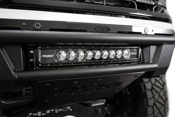 Addictive Desert Designs' Pro Bolt-On F-150 Front Bumper is the slimmest fitting bumper in our collection, and it is designed to provide prerunner styling for an aggressive look. It is engineered to closely follow the contours of the truck's front end for a tight fitment. You can outfit the center light mount with either a 20-inch radius LED light bar or up to six cube lights for improved visibility. The bumper's side steel plating and lower tube help prevent damage to your lights. The Pro Bolt-On features a heavy-duty .120-inch wall steel tube above the light mount that keeps weight and drag down while protecting your truck. The included 1/8-inch aluminum skid plate shields your front undercarriage from damage, and is vented to ensure that your intercooler and radiator receive maximum airflow when driving at high speeds. This low-profile front bumper retains the OEM intercooler location. The bumper is made from durable American plate and tube steel, and it is finished in a dual-stage hammer black powder coat. A shutter motor bracket is included and required for installation. As always, this is fully bolt-on and Made in the USA.