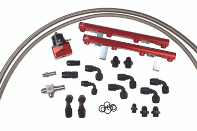 Aeromotive High Flow, Billet Fuel Rails combine 3,000 HP flow capabilities with ?bolt-on? ease of installation. Fits 1998 1/2-2004 DOHC Ford Mustang Cobra?? Rails Only. ORB-08 Ports with compact connections and positive, leak-free sealing. Full 5/8' ID through bore, capable of supporting up to 3,000 HP. Fully compatible with -10 AN line if combined with custom ORB-08/AN-10 adapter P/N 15641. Full size ports at each end for optimal injector supply and minimal hydraulic fluctuation. Additional inlet/outlet ports are provided where required for plumbing convenience. CNC-machined, billet aluminum construction for unequaled fit and finish. Steel mounting brackets, custom engineered for each application, combining a solid, durable mounting platform with correct fit and ?bolt-on? ease of?installation. Red, Type II bright dip anodized finish that looks great and protects against corrosion.