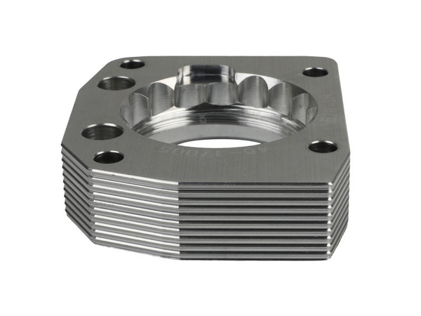The serrated/helix design creates air turbulence in the intake manifold. This turbulence increases the air pressure in the combustion chamber, resulting in increased performance and improved throttle response. The serrated/helix combination design also reduces intake whistle that occurs with helix-only designs (US PAT 07055513). This Silver Bullet throttle body spacer is precision machined from 6061-T6 billet aluminum for lightweight, high strength, and perfect fit and finish. Its black anodized finish gives a stealthy look. Adding a Silver Bullet Throttle Body spacer lengthens the intake track which helps increase intake air speed, performance and improve throttle response. This Silver Bullet throttle body spacer uses all factory mounting locations, making for a hassle-free installation. Supplied gaskets provide a perfect seal.
