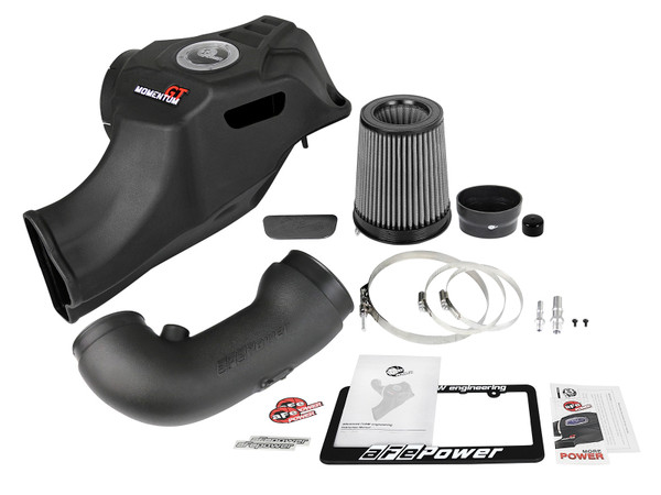 Large Three Layer Performance Air Filter:Momentum’s unique filter-to-housing interface was built to feature the largest air filter possible. This 8” tall 360-degree radial flow air filter features our oil-free Pro DRY S media with three layers of synthetic media for maximum convenience. Its progressive layering provides great filtration efficiency and dust holding capacity, while not requiring the use of oils. This media is best suited for street use. Its inverted top makes for more filter surface area, resulting in longer service intervals.Unique One-Piece Housing:The one-piece sealed housing, constructed of heat-resistant cross-linked polyethylene (XLPE), draws styling cues from the Mustang's body. It incorporates the OE air inlet with no additional hardware and features an auxiliary air inlet that captures additional air from the inner fender. Its patented filter-to-housing interface design minimizes the total number of parts, making for an easy installation. A large, clear sight window allows for hassle-free filter inspection, without having to disassemble your system.Dyno-Tuned Intake Tube:This system features a high quality, computer-designed, dyno-tuned intake tube to achieve maximum power gains while maintaining a perfect fit. Its XLPE material is heat soak resistant and extremely durable.Premium Components:Momentum GT intakes are designed with fewer parts for a fast and easy installation. This is a direct fit intake system that utilizes factory mounting points and requires no cutting or modifications. Premium T-bolt clamps, couplings, and all other hardware is included.