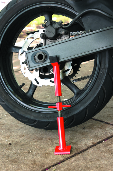 Maintain your chain or sprocket, even change your rear tire or wheel while out on the road without the need for a center stand, with the BikeMaster Liftstick. Handy and convenient to carry; perfect for street, dual sport and trail use. Liftstick includes non-slip rubber boots, which protect your motorcycle's swingarm from any scratches while claws at the base provide traction and stability during use. Made of heavy-duty steel and powder-coated to a beautiful finish. Available in black or red.