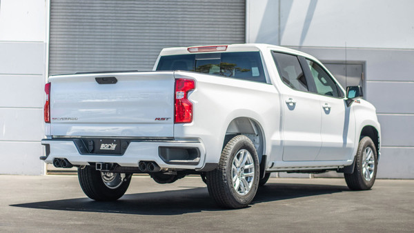 EXCEPT ZR2 & AT4X models. Factory Split Rear Exit Vehicles ONLY. Add Adapter 60706 for Crew Cab with Standard Bed (6' 7") 157" Wheelbase vehicles. This Borla(r) system has a valve simulator to prevent the Check Engine Light from coming on. The 3.5" into dual 2.75" system features the classic S-Type sound level with no drone inside the vehicle. Replace the small muffler behind the primary muffler in this Borla(r) S-Type system with Polyphonic Harmonizer 60680 to attain the ATAK(r) sound level (louder than S-Type). Optional True Dual Cat-Back(tm) system available. This system features 3.5" carbon fiber tips with bright centers. Installation REQUIRES removal of the Factory Valance Tips. Systems with bright chrome on T-304 stainless steel tips, black chrome on T-304 stainless steel tips, and systems that reuse the original equipment tips are also available. Borla(r) Cat-Back(tm) and Axle-Back exhaust systems feature patented straight-through and multi-core technology designed to unleash hidden horsepower. Increased exhaust velocity adds power, driving excitement, fuel economy, and the distinctive Borla(r) Sound of Power respected by motoring enthusiasts everywhere. Each system is built from premium T-304 stainless steel, superior to T-400 series knockoffs (such as 409), to give you the absolute best in performance and durability. Ultra-smooth mandrel bends ensure maximum flow & power, and precision computer numerical control (CNC) manufacturing ensures an accurate fit. Give your Silverado or Sierra the sound and power it deserves bolt on a Borla(r). Best of all, Borla(r) stands behind every system with a Million-Mile Warranty. Just what you'd expect from the world's most experienced (and most winning) exhaust brand.
