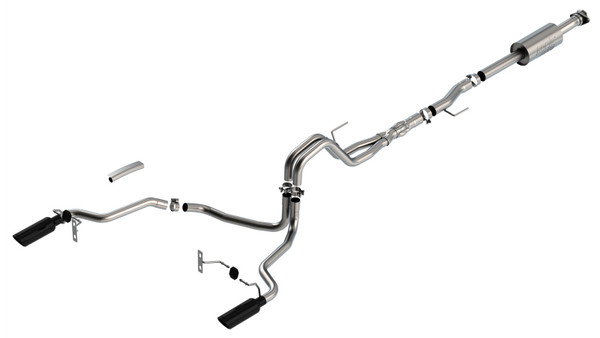 The 3" into dual 2.25" Cat-Back(tm) system was designed to enhance the power and sound of the Ford F-150 with the 5.0L. The split rear exit configuration replaces the single factory tail pipe, and has single 4" round black chrome on T-304 stainless steel tips on each tail pipe. Using Borla(r) Stainless Steel Polish p# 21461 is NOT recommended with these black chrome tips. We suggest cleaning the tips with hot water and a microfiber cloth. A system with bright chrome on T-304 stainless steel tips is also available. This system features Borla(r) 'S Polyphonic Harmonizer Technology which utilizes patented units that contain pipes of different diameters and lengths to create multiple exhaust notes that harmonize to deliver a clean, rich, full-bodied sound. This system features the aggressive ATAK(r) sound with no drone. Additional systems are available with different options for sound level, tip finish and tip exits. Add adapter 60556 for Crew Cab with Standard Bed (6' 7) 157.2" wheelbase vehicles. Add adapter 60564 for Extended Cab with Long Bed (8' 2") 164.1" wheelbase vehicles. Borla(r) Cat-Back(tm) & Axle-Back exhaust systems feature patented straight-through and multi-core technology to unleash hidden horsepower. Increased exhaust velocity adds power, driving excitement, fuel economy, and the distinctive Borla(r) Sound of Power respected by motoring enthusiasts everywhere. Each system is built from premium, high-quality T-304 stainless steel, to give you the absolute best in performance and durability. Ultra-smooth mandrel bends ensure maximum flow & power, and computer numerical control (CNC) manufacturing ensures an accurate fit. It is backed by our Million Mile Warranty. System Features: Cat-Back(tm) System Split Rear Exit 4" Black Chrome On T-304 Stainless Steel Tips ATAK(r) Sound Level T-304 Stainless Steel Construction Bolt-On Installation Million Mile Warranty