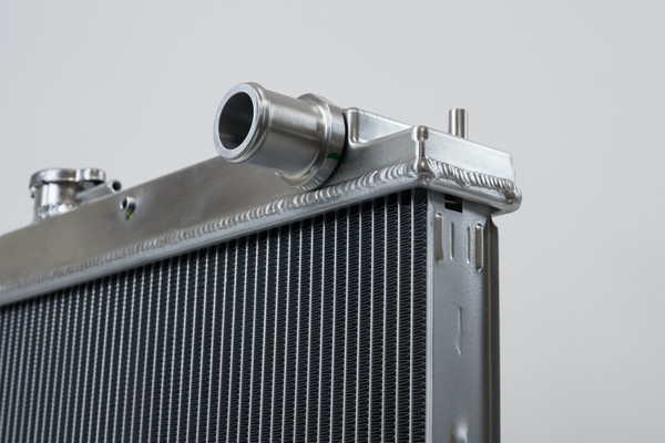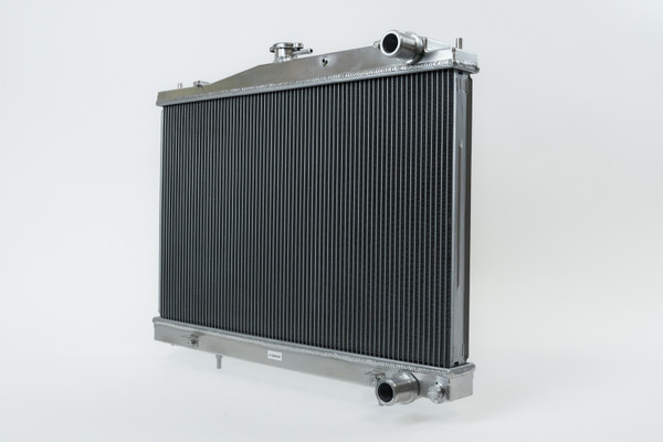The 2-Row 42mm core greatly not only increases the fluid capacity of the radiator, but also improves the cores ability to dissipate heat. CSF's Exclusive B-Tube Technology increases the heat transfer by approximately 15% over regular oval welded tubes. In addition, the super-efficient multi-louvered fins maximize airflow through the core for the best possible performance. More cooling rows also improve the overall efficiency of the radiator. More cooling tubes means more surface area for the coolant's heat to dissipate from. Each end tank is CNC machined billet aluminum giving them incredible strength and durability. CNC machining offers incredible precision and uniformity. The results are perfectly produced end tanks that perfectly match up with the ends of the 42 mm core. Hand TIG welding joins the tanks to the core creating the strongest radiator on the market for the R33 Skyline. Each radiator includes a 1.4 bar high pressure cap with an embossed CSF logo. High pressure radiator caps raise the boiling point of coolant. This helps protect the system from boiling over at higher operating temperatures. While the radiator is designed to keep the system from reaching such temperatures, it is always good to have extra protection for situations where the coolant gets too hot. The CSF #7219 comes in a raw billet aluminum finish. Also available in Black (CSF #7219B).