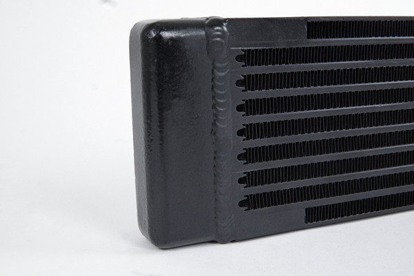 The unique design of CSF's oil cooler line has distinct advantages over conventional style oil coolers (plate-type/stacked oil coolers). The oil coolers can be placed in tighter spaces or different areas of the vehicle that don't have much vertical surface area. Longer rectangular sizes can also help with avoiding the stacking of too many coolers which may cause airflow issues to other components in the cooling system. Inlet/outlet port placement is much easier to route oil lines. Typical oil cooler lines have to be routed from different/opposite ends of the cooler often facing up or down. Usually one line has to run across from one side of the cooler to the other to then be routed together to the feed/return connection of the oil system. The CSF oil coolers are much more robust, durable, and can withstand a higher peak burst rate. This allows the cooler to be mounted in areas that might get high debris (front fascia, diff cooler, side vents, etc...). The CSF oil cooler is designed to withstand a tremendous amount of vibration and debris.