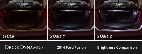 Features Add a modern, cool white appearance. Increased output with LED bulbs. Includes LED replacements for all interior incandescent bulbs. Plug-and-play, simple installation. Overview Increase your light output and add a modern appearance to your vehicle with our Interior LED Conversion Kit compatible with Ford Fusion! Factory interior lighting leaves much to be desired with a dated appearance and lackluster performance. By replacing your outdated halogen bulbs with LEDs, you’ll give your vehicle a more modern appearance, and significantly increase the output of your interior lighting. Modern Appearance. The LED bulbs included in this kit feature a 6000K true cool white output without any blue - just like factory installed LEDs. This provides a serious upgrade in the overall appearance of your interior when compared to the factory halogen bulbs. All Diode Dynamics LED bulbs are tested in-house, so you know you’re getting consistent performance. Brightness. This kit is available in two levels of brightness, Stage 1 and Stage 2. Stage 1 gives your interior an ultra-modern appearance, while providing a slight increase in output compared to your factory lighting. Stage 2 steps things up with a significant increase in overall light output throughout the interior. Plug-and-Play. The LED bulbs included in this kit feature plug-and-play connections for simple installation. Our bulbs are not constructed with cheap connectors, so you don’t have to worry about them coming loose and falling out. Simply remove your factory bulbs and these will fit right in place! Two plastic trim removal tools are included to assist with installation. If any bulb does not light up when you turn it on, simply remove the bulb, rotate it 180 degrees and reinstall.