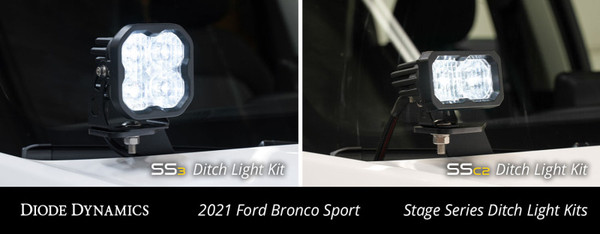 Features Bolt-on fitment compatible with Ford Bronco Sport 2021+. Allows you to mount two Stage Series LED Pods above the hood. Utilizes existing mounting points and hardware for a simple installation. Thick-gauge stainless steel construction. Inset mounts and wire routing built-in for professional fitment. Overview Perfect fitment. The Stage Series LED Ditch Light Kit compatible with Ford Bronco Sport 2021+ allows you to easily mount two SSC2 Pods above the hood. These application-specific brackets were CAD-designed to install using factory mounting points. No cutting or drilling required! This kit features a low profile design while minimizing glare, and will not interfere with raising or lowering the hood. Built to last. The brackets in this kit are constructed out of thick-gauge stainless steel. Unlike other options made out of mild steel, these brackets are full stainless steel and won't corrode over time. With their thick-gauge construction, you also won't experience any vibration or bouncing while driving. Focused. Traditional optics like reflectors or simple lenses lose light internally and to glare, so not all of the light shines on target. Instead, the custom-engineered TIR optic in the SS3 and SSC2 collects all of the light from the LED, and directs it only where you need it, drastically reducing glare and improving total efficiency. Proven Reliability. Stage Series LED lighting has been extensively tested for long-term operation from -40 to 185 degrees F, along with vibration, moisture intrusion, and corrosion testing. All of these tests are completed to SAE standards, just like factory components. They've also been put to the test on-road by racers and enthusiasts alike.