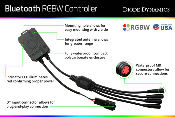 Features Full multicolor and True White functionality with our App. 20 adjustable patterns, plus custom modes, camera match, and audio sync. Easily group multiple controllers. Fully waterproof and shockproof. Overview Full RGBW. Unlike other RGB controllers on the market that produce a mixed white color, this controller is full RGBW, with an independent White channel that gives you a crisp, clean white output for everyday use. Easy Connection. The M8 controller features a fully waterproof, compact polycarbonate enclosure, along with DT input and M8 output connectors for secure connections. Simply plug into any standard 12V signal and connect the outputs directly to your RGBW products. No cutting, crimping, or splicing! This controller also includes a red power indicator LED, mounting tab and mounting pad surface for easy installation. Robust components also allow up to 2A output per channel. App Control. With the Diode Dynamics multicolor app, you can choose any color under the sun, including True White. Preset Patterns and Colors make it easy to use, and Camera Match and Music Sync make it fun to show off! Don't see a pattern you like? Just program your own, and save it for later! Instant Function. Don't wait around to see your lights. This controller will light up immediately to the previous setting when it gets power, no need to access the app. Connecting to the controller takes seconds as well, not minutes. Instant response, instant control, for an excellent user experience. Compatability Works with Diode Dynamics RGBW products with M8 connectors Works with many generic RGBW products (may require JST-to-M8 adapter)