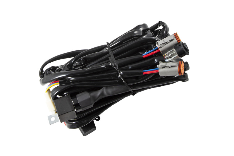 Features Powers Diode Dynamics LED pods with backlight functionality. Connects directly to the battery to power your LED pods. High capacity 14AWG wiring. Dual Deutsch DT output connectors. 30A waterproof fuse, and 60A 12V relay to safeguard the electrical systems in your pods. Overview Stage Series. This harness is intended to be used with our Stage Series pods with backlight functionality. This harness connects directly to your vehicle's battery and allows you to power your offroad lighting. It features a three-way switch to toggle between the backlight, off, and the main beam. This harness uses high capacity 14AWG wiring and Deutsch DT connectors for simple plug-and-play installation. This harness safely powers up to 25A of auxiliary lamps. Please refer to the current draw data below. C1 Sport: 1.2A C1 Pro: 1.7A SSC2 Sport: 0.6A SSC2 Pro: 1.75A SS3 Non-Backlit Sport: 2.9A SS3 Non-Backlit Pro: 1.2A SS3 Non-Backlit Max: 3.3A SS3 Backlit Sport: 1.06A SS3 Backlit Pro: 2.87A SS5 Sport: 2.8A SS5 Pro: 6.7A Control through OEM Aux Switches. This harness includes an OEM aux switch adapter wire that allows you to control your lights using a factory-installed aux switch bank. Two switches will be used - one for the main beam, and one for the backlight. For those who don't have the aux switch bank, you will use the included toggle switch adapter wire to mount a switch.