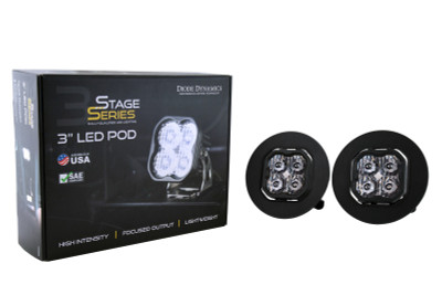 Features Advanced TIR optics provide high efficiency and focus SAE-compliant road-legal output Includes round bezel, for factory-style appearance Plug and play, no modification needed Durable powdercoated aluminum extrusion Engineered and Assembled in USA Overview Overview. Upgrade your fog lights with our SS3 Type GM Fog Light Bracket Kit! Featuring higher output intensity than any other 3in light on the market, these LED pods have been designed for maximum functionality, with custom-engineered TIR optics shining in highly useful beam patterns, all in a durable package. With the included round bezel, the SS3 Fog Kit has a clean, factory-style appearance, only much brighter! Plug and Play. Thanks to custom-molded brackets, the SS3 Fog Light Bracket Kit can be installed on your vehicle in minutes. Simply remove your factory fog light assembly and ours will bolt right in its place! Wire adapters are included with the kit, allowing you to connect the lights to your factory bulb sockets - no additional wiring needed! Backlight Functionality. The Stage Series 3in LED Pod is now available with a distinctive backlight, in a brilliant amber color. The SS3's backlight fully illuminates the TIR optic, providing a more unique and modern look than the small indicator LEDs found in other products. SAE Compliant. When installed as a pair and aimed in accordance with your state's regulations the Driving White pattern meets SAE J581 standard as a Driving/Auxiliary High Beam Light and the Fog pattern meets SAE J583 standard as a Foglamp for legal on-road use.