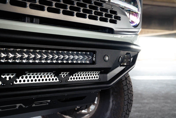 The DV8 Offroad Competition Series Bronco Front Bumper is the lowest profile bumper in our line. Its design offers superior protection extending from the front of the Bronco to the differential. The included steel skid plate serves as a direct replacement to the OEM plastic or metal skid, and features bolt-on side gussets for extra engine protection. It provides an improved approach angle over the stock front bumper & skid.
