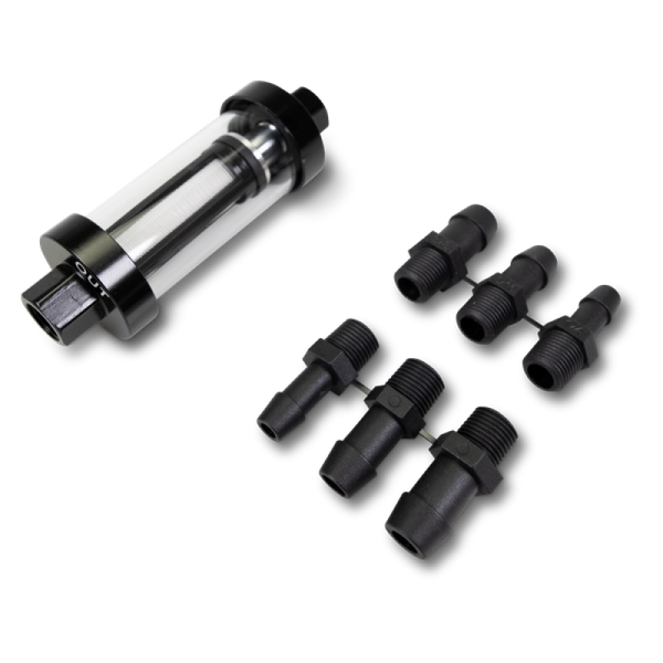 The Edelbrock Clear View Fuel Filters dress up any carbureted car’s engine bay and provide a quick visual check of fuel flow and fuel condition. Fully machined aluminum ends are E-coated for durability with laser inscribed details. The 100-micron filter keeps dirt and debris from clogging up the small passages of your carburetor. Filter elements are easily replaced using kit PN 8749. PN 8750 includes multiple interchangeable injection-molded threaded nipples to fit ¼”, 5/16” or 3/8” i.d. hose sizes.