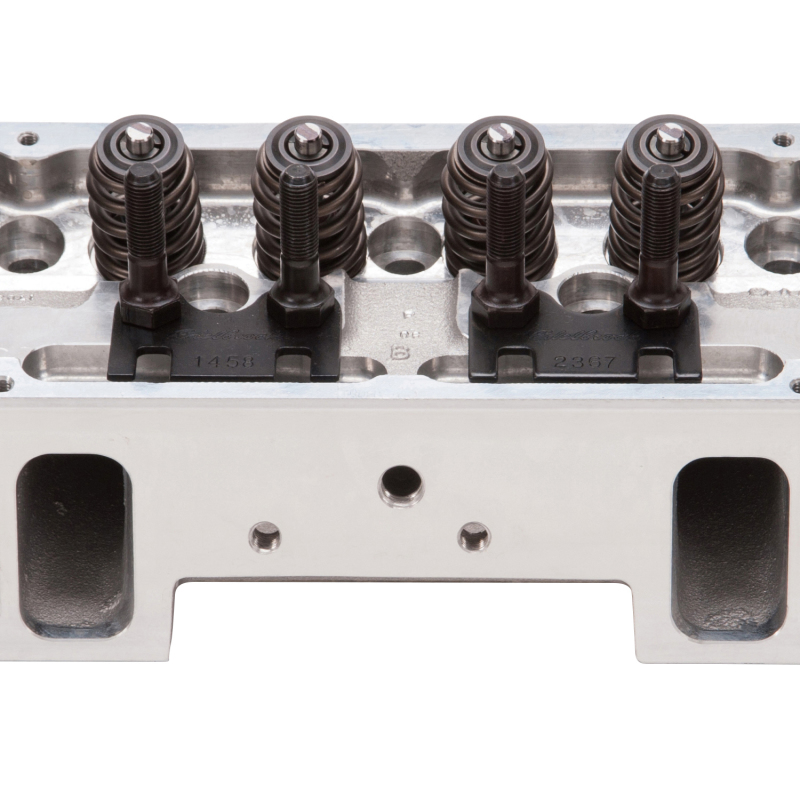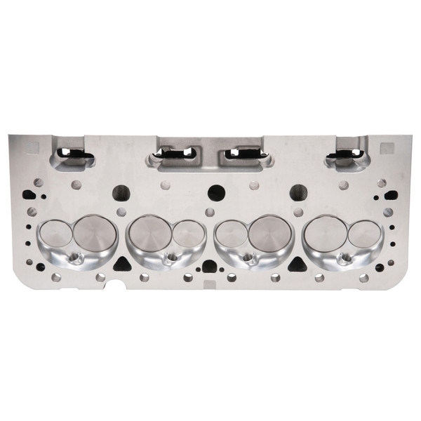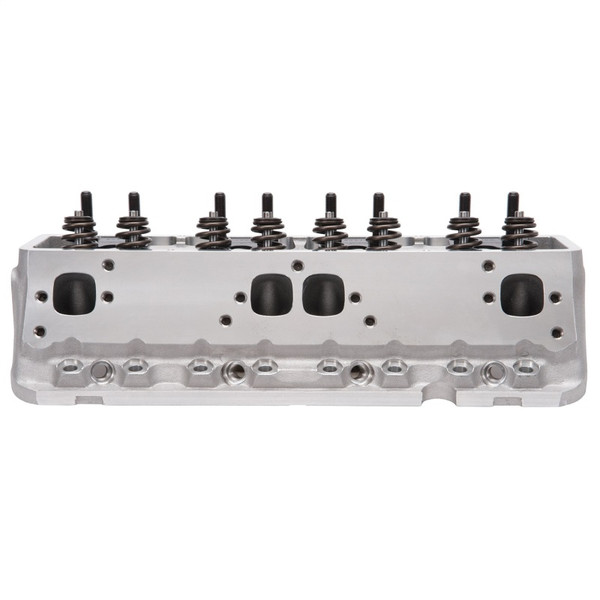 Edelbrock part #61255 Victor Jr. 23deg 220 cylinder head is designed for small-block Chevy Its 64cc combustion chamber yields around 10:1 compression ratio in a typical flat-top application and about 12.5:1 when used with some of the most common 12cc dome pistons. One of the key features of the Victor Jr. 23deg 220 cylinder head is the CNC machined chambers and bowls, which result in consistency and improved performance. They also feature angled spark plug holes and maintain the stock 23deg valve angle as well as the intake flange bolt pattern for use with 1986 and earlier intake manifolds. All of this allows this cylinder head to deliver 530-580 hp potential right-out-of-the-box, making them ideal for a budget minded engine build desiring a high quality cylinder head that still uses a stud and guide plate rocker system. Cylinder Head Specifications: - Exhaust port location: Raised .300" - Spark plug fitment: 14mm x .750 reach, gasket seat