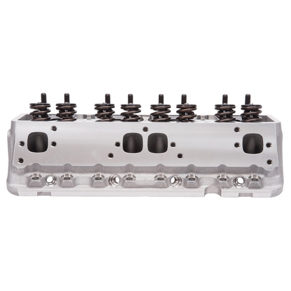 Edelbrock part #61259 Victor Jr. 23deg 220 cylinder head is designed for small-block Chevy Its 64cc combustion chamber yields around 10:1 compression ratio in a typical flat-top application and about 12.5:1 when used with some of the most common 12cc dome pistons. One of the key features of the Victor Jr. 23deg 220 cylinder head is the CNC machined chambers and bowls, which result in consistency and improved performance. They also feature angled spark plug holes and maintain the stock 23deg valve angle as well as the intake flange bolt pattern for use with 1986 and earlier intake manifolds. All of this allows this cylinder head to deliver 530-580 hp potential right-out-of-the-box, making them ideal for a budget minded engine build desiring a high quality cylinder head that still uses a stud and guide plate rocker system. Cylinder Head Specifications: - Exhaust port location: Raised .300" - Spark plug fitment: 14mm x .750 reach, gasket seat