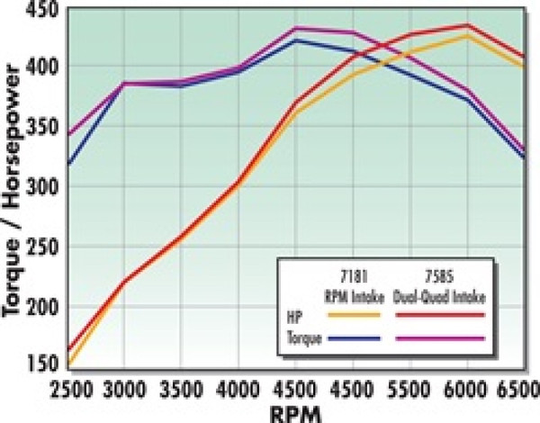 Edelbrock part #7585 RPM Air-Gap Dual-Quad 351W intake manifold is designed for 351W small-block Fords. This intake offers performance improvements in the 1500-6500 rpm range. The large runners feature our unique Air-Gap design that separates the runners from the hot engine valley for a cooler, denser charge and more horsepower. Includes bosses for rear water crossover. Carb center to carb center is 6-7/16".