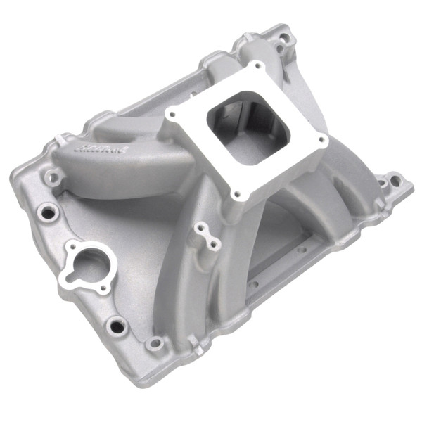Edelbrock part #2810 Victor Oldsmobile 455 drag racing intake manifold provide power levels never before available for competition single-carb 455 Olds engines. In independent flow testing, our port-matched design out-flowed the best fully ported manifolds on the market. Featuring a single-plane "Air-Gap" design, they are available for square-bore or 4500 Series carbs to accommodate many competition applications, and offer significant horsepower increases over existing intakes in the 4500 to 7500 rpm range. With a carb mount pad height of 8.2", this manifold stand more than three inches taller than the Edelbrock Torker manifold and incorporate a high-flow 3.4-square-inch runner. We've removed the intake bolts between the runners, thus creating a smoother airflow path for higher airflow and more power! This intake manifold features a port size and shape that has been optimized to match the flow characteristics of Edelbrock Performer RPM #60519 aluminum cylinder heads.