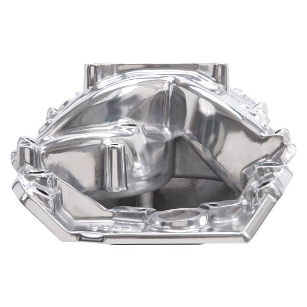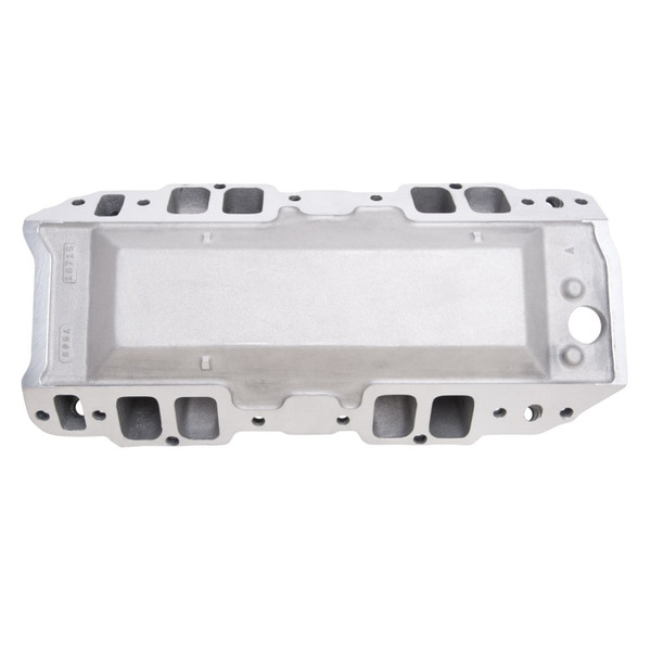 Edelbrock part #75621 RPM Air-Gap 2-R intake manifold is designed for street 396-502 c.i.d. Chevrolet V8's with high-performance rectangular-port heads. The open air space separates the runners from the hot engine oil, and as a result, the air/fuel mixture stays cooler for a denser charge and more power. This intake manifold is a dual-plane, high-rise design with a 180 degree firing order to produce incredible top-end horsepower while retaining good throttle response. The larger plenum and runners match the free-flowing exhaust, high-lift cams and other modifications of a high output engine. They are intended for high-performance's street or competition engines that run up to 6500 rpm. Includes rear water outlets, two distributor clamp locations and nitrous bosses. Accepts all late model alternator and A/C brackets for the street. For square-bore carbs only. No provision for exhaust heated chokes and no exhaust crossover. This manifold offers a polished finish for a brilliant shine and classic look.