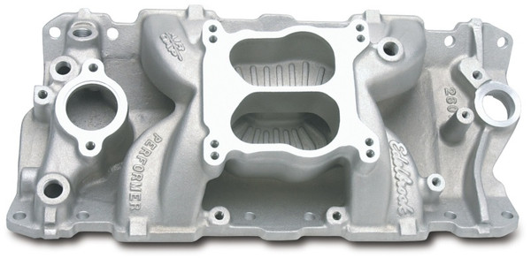 Edelbrock part #2601 Performer Air-Gap intake manifold is designed for 1955-86 262-400 c.i.d. small-block Chevys. This Performer Air-Gap intake manifold features an air-gap design for the ultimate street performance in the idle to 5500 rpm range. This design features an open air space that separates the runners from the hot engine oil resulting in a cooler, denser charge for more power. High-velocity runners deliver excellent throttle response throughout the power band. The great looks of the Performer Air-Gap along with the solid idle to 5500 rpm performance makes this an ideal choice for street rods and street machines. No provision for exhaust heated chokes or exhaust crossover. Fits spread-bore or square-bore carburetors. Will not fit under stock Corvette hood.