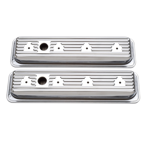 The Edelbrock #4446 Signature Series Valve Covers are designed for Chevrolet 262-400 '87-95 Center bolt applications. Engineered for function and styled for great looks, Signature Series valve covers have stock-style breather baffles that prevent oil passage to the PCV valve. These quality valve covers accept all emissions equipment, including PCV valve holes. Rubber grommets for the breather and PCV valve holes are included. Matching breathers sold separately.