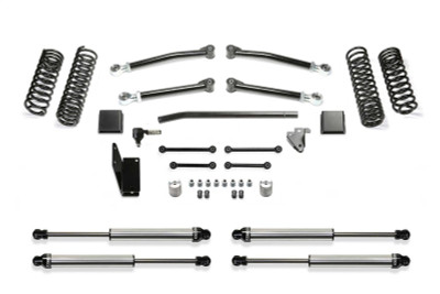 This Trail Lift Kit provides enhanced suspension performance to address all variants of off highway travel use including rock crawling, aggressive trail use and overland expeditions. This Gladiator lift kit has been tuned with proper dual rate coil springs and shock valving to provide a very compliant ride that you will appreciate. The system is a complete short arm suspension that utilizes the factory lower control arm mounts for an easy installation. The Fabtech lower link arms are constructed of thick wall steel tubing that are guaranteed never to bend. They come with large polyurethane bushings on one end with internal threads on the other to accept the groundbreaking Fabtech 5 Ton Joint? for longevity and a quiet ride. Fabtech?s dual rate Gladiator coil springs are corner specific to the Jeep JT. This keeps the vehicle level side to side and allows for increased suspension travel. The first stage of the spring provides a soft ride with the ability to extend for additional travel. The second stage is designed to handle the payload of the vehicle and address large impact absorption at higher speeds. To address the steering geometry with the increased ride height, a Draglink Flip kit along with a heavy duty Track Bar bracket is included. This relocates the Gladiator steering geometry to the factory plane allowing for full articulation without binding the draglink ends in extreme conditions. The rear Gladiator suspension receives a heavy duty Track Bar bracket to center the axle under the vehicle with the new ride height and help retain the factory roll center of the vehicle. Front and rear bumps stop extensions protect the Jeep Gladiator suspension from over cycling. This popular Jeep Gladiator lift kit is a top choice for daily drivers that enjoy tackling tough trails and overlanding with the comfort that they have a high quality complete suspension under their Gladiator. FEATURES: CONTROL LINK ARMS - Proper factory bushing cross bolt angles are parallel