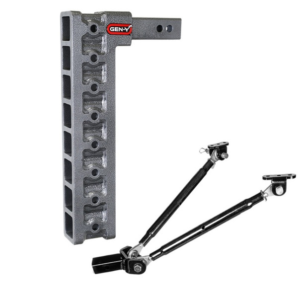 GEN-Y's Mega-Duty Adjustable Drop Hitches start at 10,000 LB towing capacity and go up to 32,000 LB towing capacity. There are multiple drop options as well depending on your trailer towing needs. Catalog Datasheet