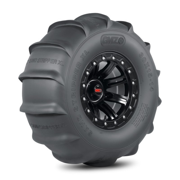 GMZ Race Products Sand Stripper and Sand Stripper TT Tires feature an extra wide footprint that provides maximum flotation and smooth dune transitions. Thick rim guard material keeps sand out of the bead while protecting wheel lip and the tough bias construction delivers long lasting durability. Front tires are available in the original Sand Stripper design with concaved tread ribs for responsive steering or the TT design that combines concaved tread ribs with a lateral traction block, maximizing the all-wheel drive power to climb steep hills faster. Rear tires are available in deep cut models designed for naturally aspirated machines, delivering extreme acceleration or staggered paddle models for smaller performance machines.