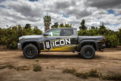 ICON Vehicle Dynamics V.S. 2.5 Series remote reservoir front coilover shocks are an incredible upgrade for the front end of the 2024-2025 Toyota Tacoma. These adjustable coilovers allow up 1.25-3” of lift height adjustability, allowing the use of larger, more aggressive wheel and tire combinations. ICON’s Vehicle-specific shock length and valving, their large 2.5” shock body with increased piston surface area over stock components, and their pairing with an ICON front differential drop (4WD only), yield the maximum travel possible along with superior ride quality and suspension performance both on- and off-road. Remote reservoirs greatly increase shock oil volume and heat dissipation surface area to resist overheating and cavitation under hard use, which can lead to damper fade. ICON's exclusive Compression Damping Control Valves are included for precisely dialing in your suspension performance. CDCV controls fluid flow under compression, allowing you to achieve the perfect tune whether driving on the street, slow-crawling through the rocks or mobbing across the desert at full throttle. When paired with ICON 2.0 or 2.5 Aluminum Series rear shock absorbers vehicle control will be balanced front to rear, resulting in the best overall driving experience for your Toyota Tacoma.