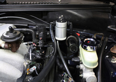 During the process of venting crankcase pressure back through your intake track, large amounts of oil, in the form of vapors can gather/accumulate in your intake tube, intake manifold runners and even dilute your gas, lowering its octane level. This happens on all engines and is even worse with forced inducted vehicles (supercharged and turbocharged) as crankcase pressures are increased. To combat this, we have developed an oil separator of our own design. Milled from solid billet aluminum this is a rock-solid piece. It has a knurled tank base for easy removal to drain the spent oil and an O-ring seal to prevent any leaks. Filtering consists of a fine mesh stainless steel screen that traps fine oil vapors and releases them once heavy enough to fall. They then pass through a 1/2" thick 1/16th" aluminum honeycomb filter where they grow every larger and then fall into the bottom. By the time the oil gets through the filter it's too heavy to be passed on into the intake. The tank holds 3 oz of fluid, while that may not sound like a lot, you shouldn’t see that much oil in your PCV system. Drain it every 2000-3000 miles and you will never come close to filling it.