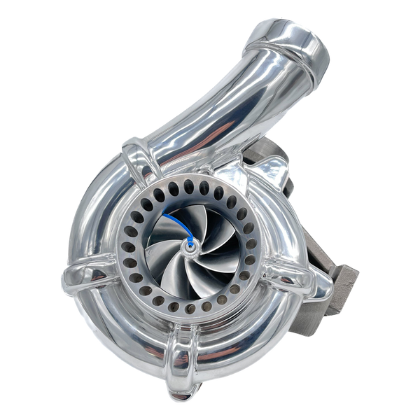 This is the biggest and baddest drop in Low Pressure 6.4 turbo on the market. We spent years testing, modifying and trying all the different options currently out there and then we blew them out of the water. This is the ONLY turbo on the market with a 4" larger inlet with ported anti-surge cover, larger 360 thrust bearing, and larger s400 turbine wheel. This allows for more power, quicker spool, and less EBP than anything else on the market. Our drop in low pressure turbo all by itself has outperformed every other set we have tested.