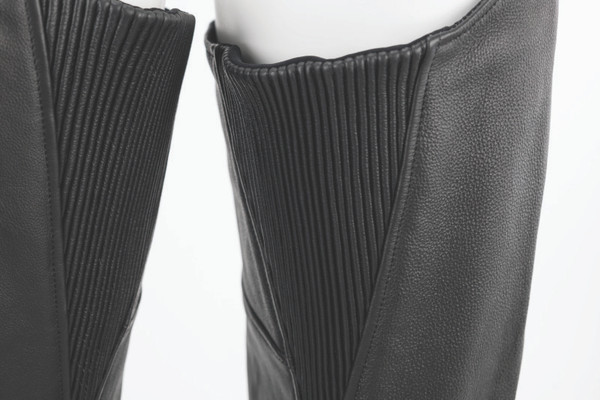 Medium weight chaps with leather facing and fixed nylon mesh lining. Designed for comfort on any ride, the Long Haul features powerstretch gussets on the inner top thigh, adjustable lacing at the center back and zippered outseam with snap closure and wind flap.