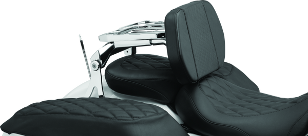 A truly multi-purpose backrest and luggage rack system only available from Kuryakyn. Once installed you can make any adjustments needed, including switching from rider to passenger backrest, without any tools. Sturdy aluminum main frame, steel folding luggage rack with rubber inserts and comfortably padded backrest. Backrest pad is fully adjustable via stainless sliding rods with push-button locks and knurled threaded knobs.