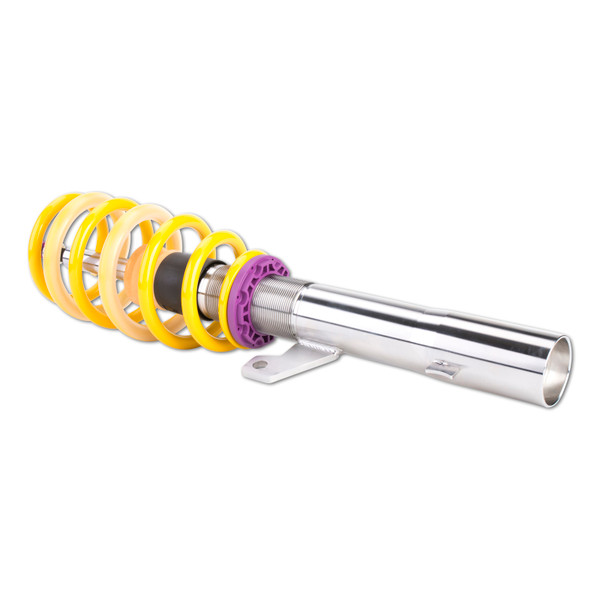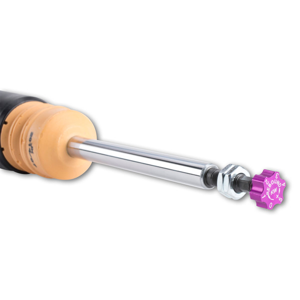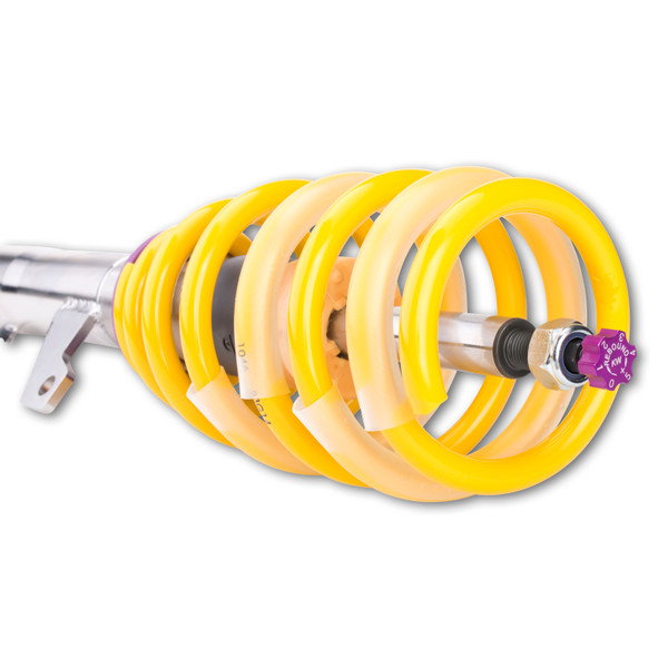 Is your factory sport suspension too firm? Do you want a sporty look and driving dynamics without having to compromise comfort? KW V2 comfort coilovers take the already stellar ride and reputation of KW suspensions coilover systems to the next level of comfort. Designed specifically to maximize comfort KW V2 Comfort coilovers provide a subtle lowering with adjustable ride height and rebound damping adjustability allowing the handling or the comfort to be individually tailored as desired via the integrated rebound adjustment knobs. KW V2 Comfort coilovers offer the perfect compromise of driving dynamics and ride comfort. With the KW V2 Comfort coilover kit, your comfort-oriented driving pleasure is the focus. That's why our test engineers evaluate the setups on numerous highways and country roads with various road surface types. The KW V2 Comfort coilover kits are suitable for all drivers who want to combine the joy of a decent lowering with driving comfort. With the 16-click adjustable rebound damping (TVR-A-technology), you can tune the KW dampers on the KW V2 Comfort coilover kits to make it more comfortable or sportier. The two-stage, patented TVR-A (Twin Valve Rebound - Adjustable) technology enables a small volume of oil to flow through an adjustable, conically shaped, low-speed bypass during low damper speeds, while in the case of higher damper speeds, the main rebound stage valve opens allowing a larger volume of oil to flow. This provides a big improvement in terms of ride comfort without influencing the safety-relevant high-speed range. There are 16 precise clicks available for individual settings, so you can choose between more comfort or more body control. The KW V2 Comfort coilovers, made using INOX-LINE stainless steel technology, enables a vehicle-specific lowering within the tested adjustment range of 10 to 40 mm.