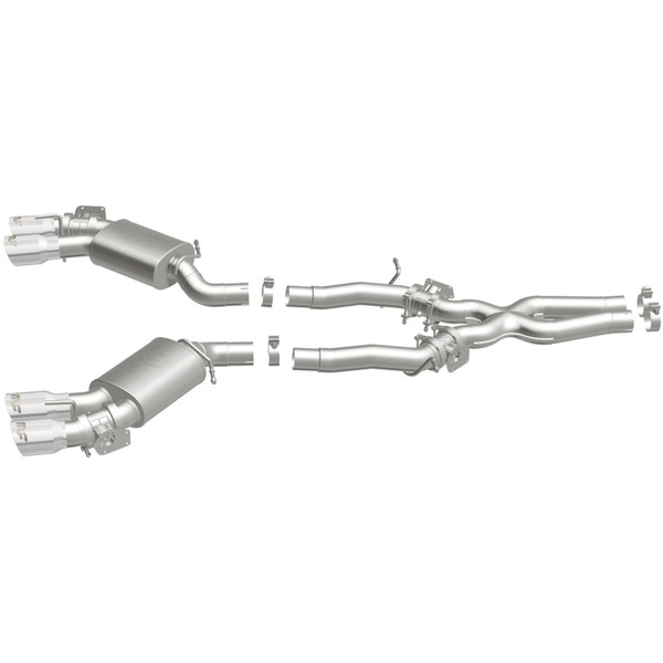 The MagnaFlow 2016-2024 Chevrolet Camaro Competition Series Cat-Back Performance Exhaust System 19265 brings an aggressive, attention-grabbing edge to the deep resonant exhaust note we're so well known for. This exhaust kit is designed to enhance your 6.2L 2016-2024 Chevrolet Camaro with dyno-proven performance made possible thanks to fast-flowing mandrel bent 3in. main piping and 2 Straight-Through mufflers ending in a Quad Split Rear exit with 4in. Polished Welded-On Double Wall Angle Cut Folded Edge tips featuring a sporty finish. The exhaust system's cat-back layout replaces your ride's exhaust system from near the catalytic converter on back. Exhaust system 19265 is engineered to make your vehicle's engine produce Aggressive exterior and Moderate interior sound levels, befitting its competition-oriented design. 19265's direct-fit design makes installation a breeze thanks to the use of advanced 3D scanning techniques. This performance exhaust system is made of 100% durable and corrosion-resistant stainless steel and produced using CNC precision robotic manufacturing, all backed by MagnaFlow's limited lifetime warranty. Please check to ensure compliance with local noise regulations.