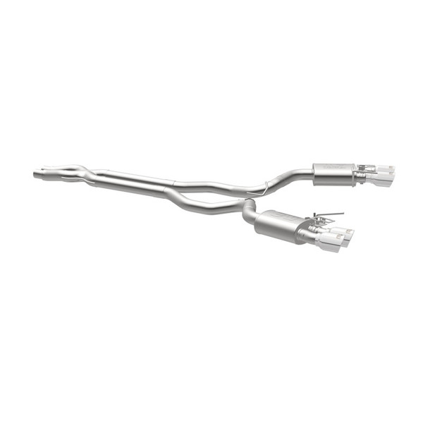 The MagnaFlow 2015-2020 Ford Mustang Competition Series Cat-Back Performance Exhaust System 19283 brings an aggressive, attention-grabbing edge to the deep resonant exhaust note we're so well known for. This exhaust kit is designed to enhance your 5.2L 2015-2020 Ford Mustang with dyno-proven performance made possible thanks to fast-flowing mandrel bent 3in. main piping and 2 Straight-Through mufflers ending in a Quad Split Rear exit with 4in. Polished Welded-On Double Wall Angle Cut Folded Edge tips featuring a sporty finish. The exhaust system's cat-back layout replaces your ride's exhaust system from near the catalytic converter on back. Exhaust system 19283 is engineered to make your vehicle's engine produce Aggressive exterior and Moderate interior sound levels, befitting its competition-oriented design. 19283's direct-fit design makes installation a breeze thanks to the use of advanced 3D scanning techniques. This performance exhaust system is made of 100% durable and corrosion-resistant stainless steel and produced using CNC precision robotic manufacturing, all backed by MagnaFlow's limited lifetime warranty. Please check to ensure compliance with local noise regulations.