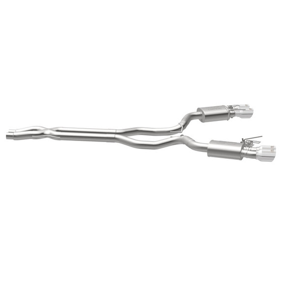The MagnaFlow 2015-2020 Ford Mustang Competition Series Cat-Back Performance Exhaust System 19283 brings an aggressive, attention-grabbing edge to the deep resonant exhaust note we're so well known for. This exhaust kit is designed to enhance your 5.2L 2015-2020 Ford Mustang with dyno-proven performance made possible thanks to fast-flowing mandrel bent 3in. main piping and 2 Straight-Through mufflers ending in a Quad Split Rear exit with 4in. Polished Welded-On Double Wall Angle Cut Folded Edge tips featuring a sporty finish. The exhaust system's cat-back layout replaces your ride's exhaust system from near the catalytic converter on back. Exhaust system 19283 is engineered to make your vehicle's engine produce Aggressive exterior and Moderate interior sound levels, befitting its competition-oriented design. 19283's direct-fit design makes installation a breeze thanks to the use of advanced 3D scanning techniques. This performance exhaust system is made of 100% durable and corrosion-resistant stainless steel and produced using CNC precision robotic manufacturing, all backed by MagnaFlow's limited lifetime warranty. Please check to ensure compliance with local noise regulations.