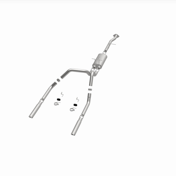 The MagnaFlow Street Series Cat-Back Performance Exhaust System 15796 brings out the personality of your Truck with our signature resonant, powerful engine tone and dyno-proven performance. Thanks to its fast-flowing, mandrel bent 2.5in. main piping and 1 Straight-Through mufflers ending in a Dual Split Rear exit with 3in. Polished Clamp-On Single Wall Angle Cut Cut Edge tips, this Truck exhaust kit has the performance chops to match its sporty sound and appearance. Upgrade your ride to the next level with an exhaust that has the pipes to put other Truck's to shame. With this system your vehicle will be producing Aggressive exterior and Moderate interior sound levels while leaving other cars and trucks feeling envious at every stoplight. Exhaust kit 15796 features a cat-back layout that replaces your ride's stock exhaust components from near the catalytic converter on back. Extensive 3D scanning during development has resulted in a direct-fit design that you can easily install yourself. 15796 is produced using CNC precision robotic manufacturing techniques and is backed by MagnaFlow's 1-year limited finish warranty and limited lifetime construction warranty.