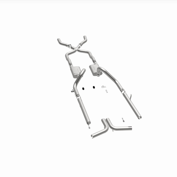 The MagnaFlow 1955-1957 Chevrolet Bel Air Street Series Crossmember-Back Performance Exhaust System brings enhanced engine sound and dyno-proven performance to your 4.3L, 4.6L 1955-1957 Chevrolet Bel Air with a healthy helping of our deep, resonant signature exhaust note at Aggressive exterior and Moderate interior sound levels. Thanks to its durable, corrosion resistant stainless steel design, this Chevrolet Bel Air exhaust system will handle whatever tarmac you decide to leave your mark on. This performance exhaust kit features a crossmember-back layout designed to replace your Chevrolet Bel Air's exhaust system from the crossmember on back. With its fast-flowing, mandrel bent 3in. main piping and 2 Straight-Through mufflers ending in a Multiple Exit Options exit that you can enhance with tips of your choosing, your muscle car will be sounding as awesome as it looks. Extensive 3D scanning during development has resulted in a direct-fit design that you can easily install yourself. 16596 is produced using CNC precision robotic manufacturing techniques and is backed by MagnaFlow's limited lifetime construction warranty.