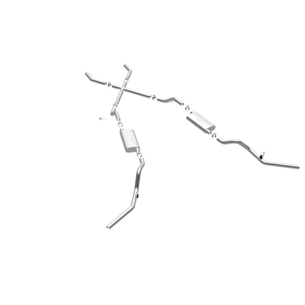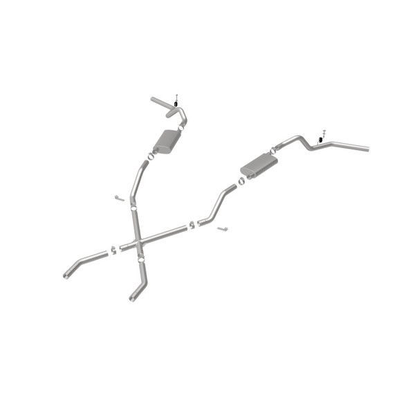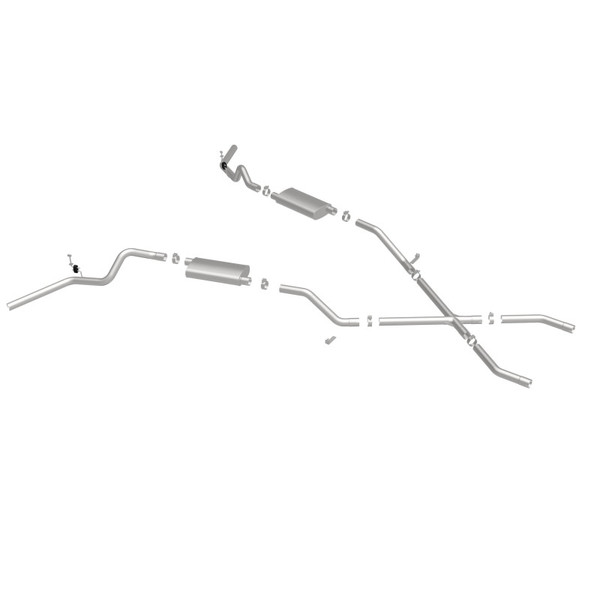 The MagnaFlow Street Series Crossmember-Back Performance Exhaust System 16643 brings enhanced engine sound and dyno-proven performance to your 3.8L, 4.1L, 4.3L, 4.6L, 4.8L, 5.0L, 5.3L, 5.7L, 6.5L, 6.6L 1960-1972 Chevrolet with a healthy helping of our deep, resonant signature exhaust note at Aggressive exterior and Moderate interior sound levels. Thanks to its durable, corrosion resistant stainless steel design, this Chevrolet exhaust system will handle whatever tarmac you decide to leave your mark on. This performance exhaust kit features a crossmember-back layout designed to replace your Chevrolet's exhaust system from the crossmember on back. With its fast-flowing, mandrel bent 2.5in. main piping and 2 Straight-Through mufflers ending in a Dual Split Rear Behind Rear Tires exit that you can enhance with tips of your choosing, your muscle car will be sounding as awesome as it looks. Extensive 3D scanning during development has resulted in a direct-fit design that you can easily install yourself. 16643 is produced using CNC precision robotic manufacturing techniques and is backed by MagnaFlow's limited lifetime construction warranty.