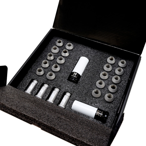Lock down your wheels with confidence. The Mishimoto Steel Locking Lug Nut 24-piece Kit features a one-piece design that eliminates the common failure points of two-piece lug nuts. Each lug nut is built from high-strength steel to resist swelling, cracking, and impact stress over time.This kit includes 16 standard lug nuts and 4 locking nuts, secured with a 7-point, non-marring locking tool to protect your wheels without damaging the finish. The 19mm hex size fits a wide range of aftermarket wheels, and the open-ended design accommodates extended studs. Available in black or silver, this kit is backed by the Mishimoto Lifetime Warranty to keep your wheels stylish and secure for the long run.