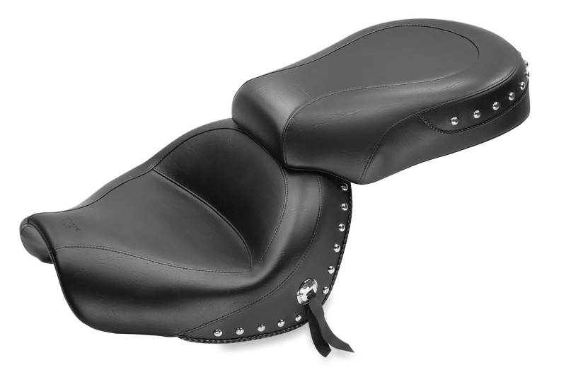 Available with or without a fully adjustable and easily removable driver backrest, the 16" wide driver bucket sits you at the ideal cruising angle and is one of several design improvements over the stock seat. The entire 12" width of the comfortable passenger seat is fully supported by Mustang's unique internal steel support wings for unbeatable 2-up comfort and support.