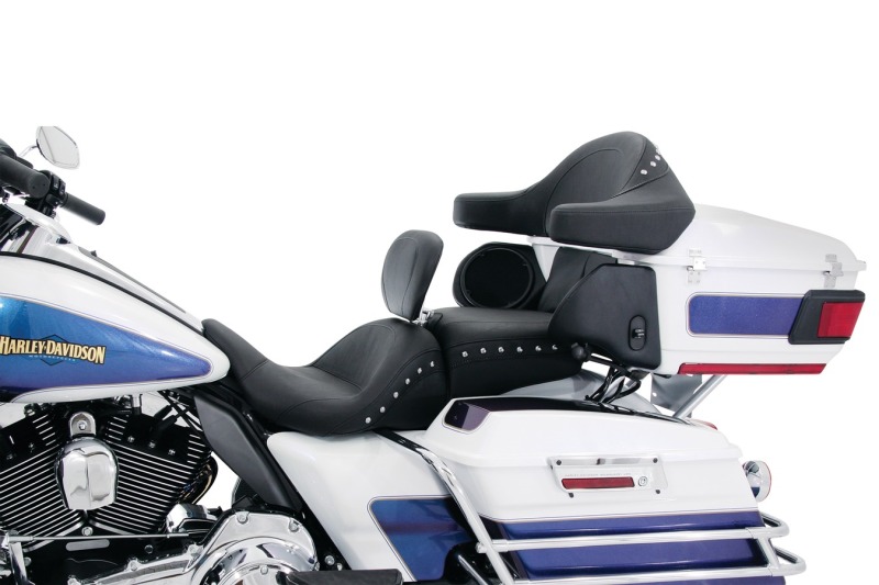 Quick view Mustang Motorcycle Mustang 93-13 HD FL Super Touring Extended Arm Wrap-Around Backrest Deluxe - Black w/Grey Stitching - 79013GM Compare $430.99 Add to Cart