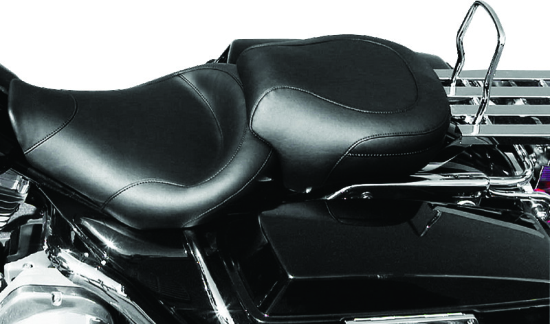 Available with or without a fully adjustable and easily removable driver backrest, Standard Touring solos feature deep bucket styling and a narrower nose than stock so the rider can more easily plant feet on the ground. The deeply contoured 15" wide driver area provides good lower back support and eliminates the driver from sliding back. Recessed Passenger seats are designed for use with the built-in driver backrest.