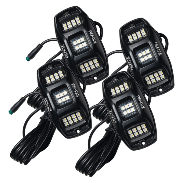 Change Colors, Control Brightness, access strobing patterns, and sync with music! This new oversized 22 LED RGB+W Dual-Control ORACLE Underbody LED Rock Lights now features Bluetooth Smartphone control PLUS Wireless Remote. This kit now features a TRUE white 6000K color and have a unique design that uses 3 separate emitters to cover the entire wheel well area. Our ColorSHIFT(tm) Technology allows you to select from thousands of colors! Control the functions and colors of your kit via the Bluetooth App, or Remote!