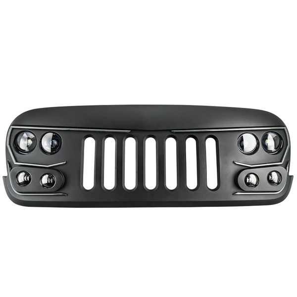 The ORACLE Lighting Vector Series Grill for the Jeep Wrangler JK is the first full-featured replacement grill with integrated LED light emitters for Low Beam, High Beam, as well as a Dynamic LED DRL. This unique design is equipped with an array of application-specific LED lighting features and has the aggressive styling and rugged durability that Jeep owners demand. These modules are now robotic-ally sealed to create an Ingress Protection Rating of IP68 which will keep moisture out of your fixtures even from exposure to pressurized water spray and brief underwater submersion. The DRL modules are now mounted with hardware rather than adhesive to make these parts easier to remove for grill painting and maintenance. Each LED beam can be independently adjusted in order to put light on the road without blinding oncoming traffic, especially important for lifted Wranglers. The separate driving and Low Beam lights allow for proper light distribution for optimal road legal light. The Vector Series Grill features an impressive 5,600 Combined Lumen Low Beam with advanced optics for precision lighting that illuminates the road for increased driver visibility without creating glare that can blind oncoming traffic. 7,200 Combined Lumen High Beam for illuminating any dark landscape. The simple wiring connection is "Plug and Play" thanks to the included harness adapter. Additional features of the ORACLE Lighting Vector Series Grill include an integrated LED Daytime Running Light which increases driver safety. This DRL also features a unique "startup sequence" Dynamic LED display. Another safety feature is the LED Turn Signal that is 4x brighter than the factory turn signal lamp. The components of this project were CAD developed to insure that the fit and finish of this product matches factory quality and fitment.