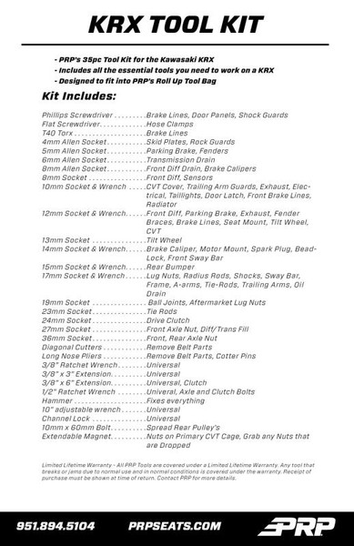 PRP's Kawasaki KRX Roll-Up Tool Kit provides everything you need to fix your Kawasaki Teryx KRX or KRX4 out on the trail. This 35 piece kit includes a selection of high-quality ratchets, sockets, wrenches, extension bars, pliers, and a ball peen hammer (for when things get really fun). We've hand picked the exact tools that are needed most when working on a KRX - So you have only the essentials that you really need, without adding the extra weight of an entire tool box. Below we have listed all the tools included, along with a handy guide to the most common uses for each tool. Each tool also includes a Limited Lifetime Warranty. The Roll-Up Bag makes it easy to keep everything neat and organized. It features dedicated sleeves for all the tools included in the kit, as well as a zippered pocket to hold the sockets and any other tools you want to bring with you. The bag is made from extremely durable twill material. It features heavy duty buckles, and an easy to carry grab handle. It can be mounted, or stored securely inside the vehicle. The roll-up style bag makes it quick and easy to grab out of the vehicle when you need it, and the tools inside don't make noise when bouncing around the trails. Don't get caught out on the trail unprepared. PRP's Roll-Up Tool Kit has everything you need to get your Kawasaki Teryx KRX going! Fitment: Kawasaki Teryx KRX & Kawasaki Teryx KRX4 KIT INCLUDES: ALLEN Sockets 4mmx3/8 - Skid plate, rock guards 5mmx3/8 - Parking brake, fenders 6mmx3/8 - Transmission drain 8mmx3/8 - Front diff drain, brake caliper TORX BITS- Sockets T40x3/8 - Brake lines SOCKETS/WRENCHES 8mmx3/8 - Front diff, sensors 10mmx3/8 - CVT cover, trailing-arm guards, exhaust, electrical grounds, taillights, door latch, front brake lines, radiator 10mm End Wrench 12mmx3/8 - Front diff, parking brake, exhaust, fender braces, brake lines, seat mount, tilt wheel, CVT 12mm End Wrench 13mmx3/8 - Tilt wheel 14mmx3/8 - Brake caliper, motor mount, spark plug, bead lock