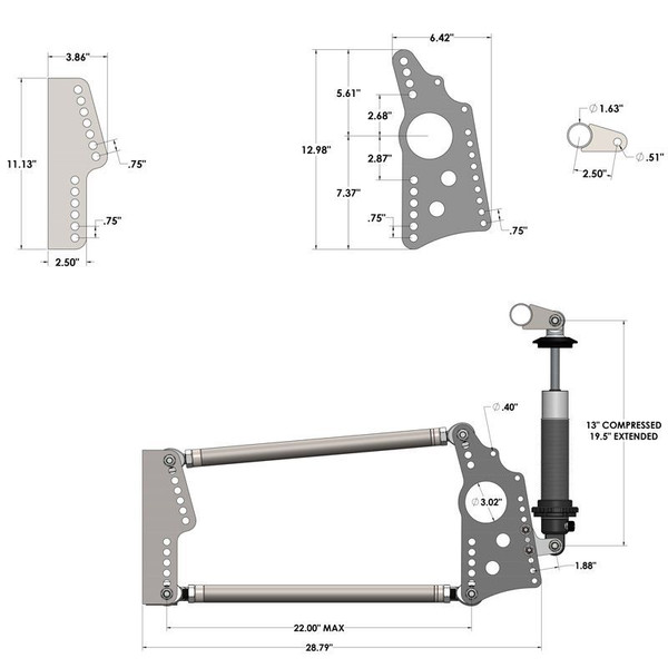 Product Overview: QA1's Heavy Duty Pro Rear Drag 4-link kit streamlines the fabrication process, delivering professional-grade results and performance in a convenient and easy-to-order kit all from one source. This 4-link system is designed for the hardcore, discerning, do-it-yourself racer looking for a no-compromise solution to take their vehicle to the next level in performance and adjustability. High quality, MIG-weldable components ensure a safe and properly engineered design that can be easily adapted into many drag racing setups. Find convenience, safety, and performance all from QA1 with the HD Pro Rear Drag 4-Link. Performance: This drag race-style 4-link design is known for its performance and adjustability, and features a wide range of instant center tuning and on-car adjustability. The components are adaptable and can be cut to length to work in any setup with 40 inch or narrower frame-rails. Heavy Duty Design: This heavy-duty design can handle the demands of high-performance racing. With inch-thick plates, 1-1/4 inch trailing arm tubes, Grade 8 hardware, and QA1 chromoly rod ends, these kits are built to put down serious power. Adaptability: This kit contains all the components and hardware needed for assembly and mounting of the trailing arms and four link. A lateral locating device is required, and you can look to QA1 for additional components that will help with drag race suspension setup. Look to the provided dimensional diagrams and renderings to help with your custom install. Kit Contents: 22 Trailing arm tubes, brackets, rod ends, tube adapters 40 shock crossmember and mounting tabs Grade 8 hardware kit Made in the USA Fitment Notes Welding required Trailing arm tubes can be cut to length Works with 3 in. axle tubes Works on 40 in. and narrower frame rails Does not include a lateral locating device