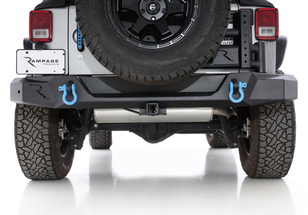 The heavy duty rear bumper includes 2 in. receiver tow hitch made of 1/4 in. steel reinforced with 7/16 in. ring. The steel welded accessory panel allows for mounting a hi-lift jack or gas can. You can mount the tire in standard or slanted position, alleviating weight from the tailgate. A 3rd brake light bracket is included but the light kit is sold separately. Modular tire carrier, part number 9950919, is sold separately.