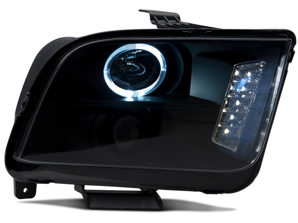 Give your 2005-2009 GT or V6 Mustang a new look with a set of Raxiom Smoked Projector headlights that feature LED Halos. These Smoked Raxiom Mustang Projector Headlights have an aggressive design that flows nicely into the lines of the S197 Mustangs. The projector lenses light up the road ahead with a bright focused beam of light that not only looks great, but improves your night visibility. The LED Halo and accent lights give an exotic flair to your Mustang that sets it apart from the rest of the herd. Equipped with H1 and H7 bulbs for high/low beams this pair of Smoked Mustang Headlights are DOT (Department of Transportation) approved for legal street use under compliance # QR1200190. These One Piece Projector Headlights include H7 bulbs for low beams and H1 bulbs for their high beams. Not intended for use with vehicles equipped with Daytime Running Lights or Aftermarket HID Kits.